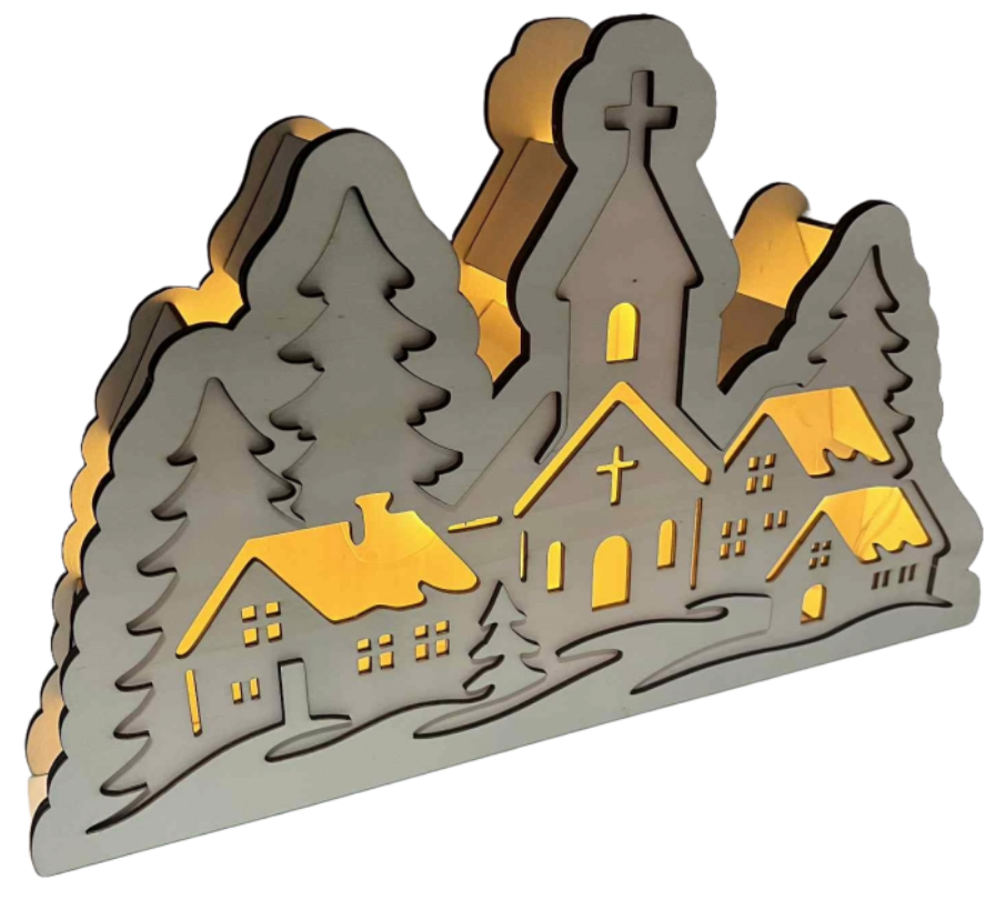 🪵 Vyrobeno z kvalitní topolové překližky. Přední vrstva s chaloupkami, uprostřed dominující kostel a zezadu jemné LED osvětlení pro pohádkový efekt.